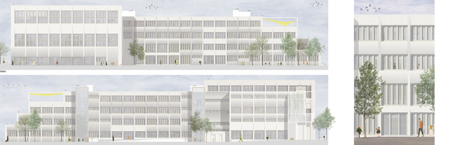 Die neue Fassade übernimmt das Motiv der vertikal strukturierten Fassadenelemente, wandelt sie in eine zeitgenössische Version um und gibt dem Einzelelement gestalterisch genug Flexibilität, um unterschiedliche Bilder an der Fassade zu erzeugen. Ziel der neuen Gestaltung ist es, die Proportionen des langen, stark durchgegliederten Baukörpers so zu verändern, dass sie für die Nutzung einer Grundschule angemessener wird. Weg von starker Rasterung und hin zu definierten Teilbereichen, die nicht nur das Gebäude besser lesbar machen, sondern ermöglicht, dass die mächtig anmutende Dimension gebrochen- und das Gebäude viel maßstäblicher wird.