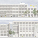 Ein zentrales Element des Bauvorhabens ist die Neuinterpretation der stark gerasterten Fassade aus den 70er Jahren. Die bestehenden vorgehängten Waschbetonplatten können auf Grund der energetischen Sanierung nicht gehalten werden. Der Abbruchbeton wird jedoch direkt recycelt und als Zuschlag für die neuen Betonfertigteile verwendet. Neben dem Originalmaterial wird auch der ursprünglichen Fassadengestaltung des Gebäudes interpretiert und in der neuen Fassade integriert.