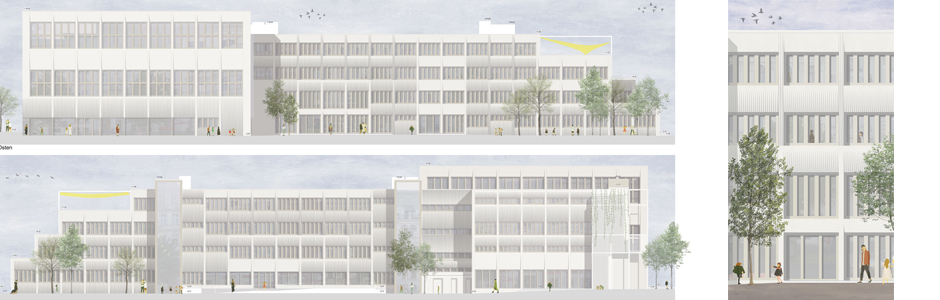 Weiterhin werden die großflächigen Dächer der Grundschule mit einem Solargründach ausgestattet, während die mittelgroßen Dachflächen eine extensive Begrünung erhalten. Diese Maßnahmen bieten einen ökologischen Vorteil und verbessern das Mikroklima. Bei der energetischen Ertüchtigung der Dächer wurde differenziert geprüft, wie viel der Bausubstanz tatsächlich erhalten bleiben kann, um die Planungsziele so recourcenschonend wie möglich zur Umsetzung zu bringen.